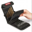 Hex shank drill bit set in fabric tool holder for drilling wood, plastics and metals. Eight HSS fully ground TiN coated twist drill bits, sizes 2, 2.5, 3, 4, 5, 6, 7 and 8mm for wood, metal and plastic. Eight carbon steel dowel (Brad point) roll fluted drill bits, sizes 3, 4, 5, 6, 7, 8, 9 and 10mm for deep boring of wood. Unique tool holder includes removable inner section with Velcro elasticated cartridges to accept an extra 8 hex power drive shanks and 8 insert bits.